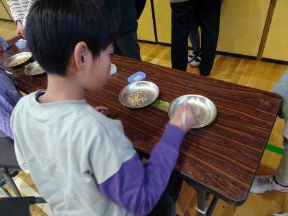 今日の中間休みに、給食委員会さん主催の豆つまみ大会がありました。