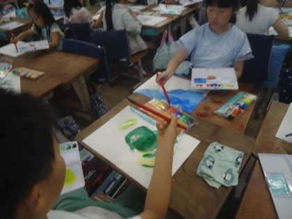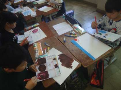 3年生は図画工作科の授業で、水彩絵の具を使って学習しています。色を混ぜ、自分だけの色を作って、それを使い、思い思いの世界を描きました。