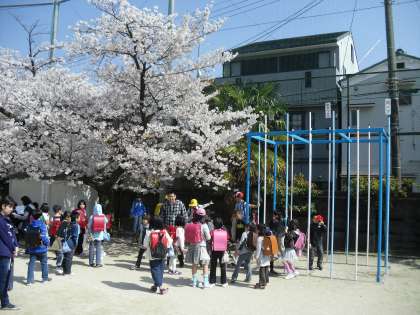 その後,「校外補導委員」さんのお話を聞き,緊急の集団下校の際,町ごとに運動場に集合する集合場所を確認してから,班長さんを先頭に集団下校しました。