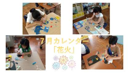 7月のカレンダーは「花火」をテーマにしました。折り紙をチョキチョキ切って、花火の火花を作りました。思い思いの色を選んで、素敵な打ち上げ花火がたくさん上がりました。