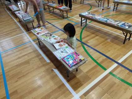 たくさんの本を手に取り、中を見ながら自分がいいなと思う本を選びます。好きな動物の本やお菓子、電車の本など自分の好きなものの本を選んでいました。
