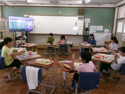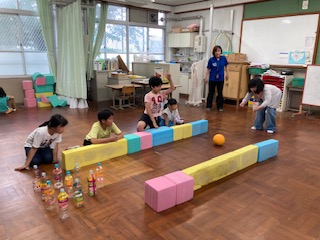 7月4日(木)に西総合支援学校のお友達が来てく交流しました。初めはみんなが好きなダンスです。「ワンダーランド」と「ジャンボリーミッキー」を踊りました。元気いっぱい楽しんで踊っていました。次にハンカチ落としをしました。みんなにこにこ、鬼になるとハンカチを持って一生懸命走っていました。最後にボーリングをしました。支援学校のお友達にボールを渡してあげたり、ピンを並べたり仲良くゲームができました。みんなで輪になって給食を一緒に食べました。みんなで一緒に食べる給食はいつもより美味しく感じました。最後はみんなで「また、来てね。」「また、遊ぼうね。」とタッチしてお別れを惜しんでいました。短い時間でしたが、楽しく交流ができました。