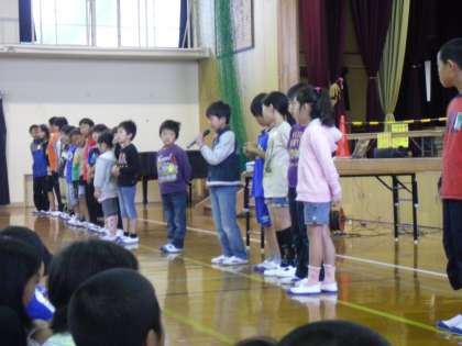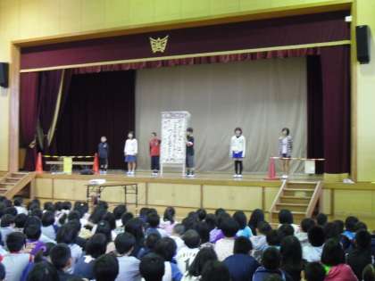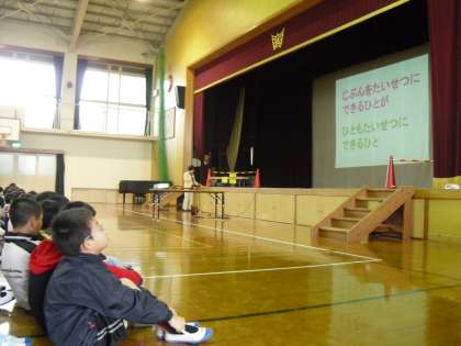 「憲法」や「人権」といっても低学年には難しいので,今年は校長先生が「自分を大切にできる人が,友だちも大切にできる人」というお話をしました。その後,全学級の学級目標の発表があり,児童会からは「やさしさは,友だちたくさん作るもと」という標語の発表がありました。