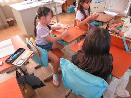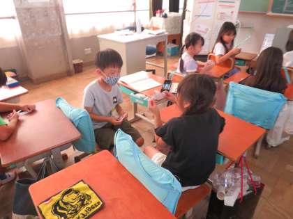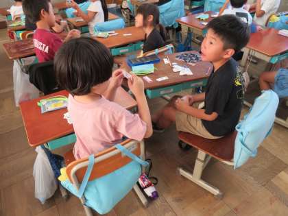 かけ算の学習が始まりました。計算カードを使って、一生懸命九九を覚えている子ども達です。