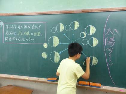 「すげぇ。三日月に見える。」など、太陽と月の位置関係が変わることで月の形が変わるというイメージがもてたようです。