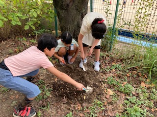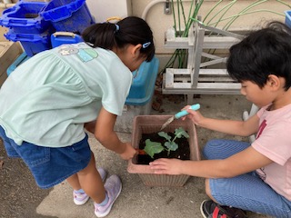 冬の野菜を色々植えています。今日はブロッコリーを植えました。初めに土づくりをしてやさしく丁寧に植えました。大きくなるのが楽しみです。玄関近くのプランターにお花も植えました。学校が明るくなるように,「おもいやり大さくせん」もがんばっています。