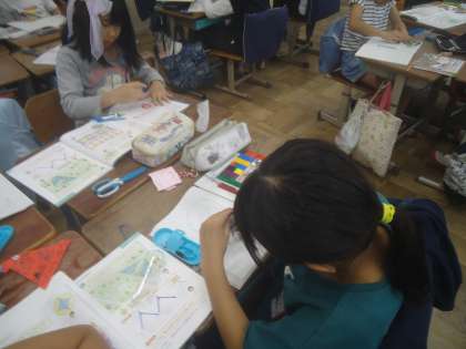 算数科「円と球」でコンパスを初めて使い、円の作図しています。