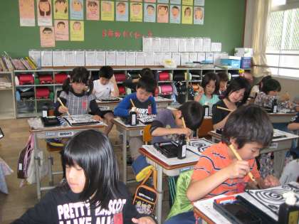 初めて使う筆を持って,ドキドキしながら書きました。