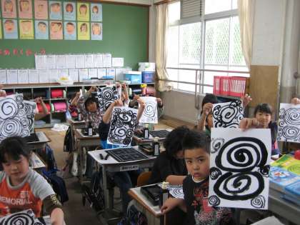 始めは,横の一縦の一を書き次はぐるぐるうずまきを書きました。