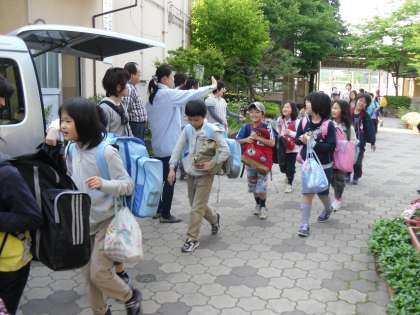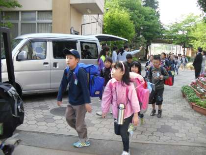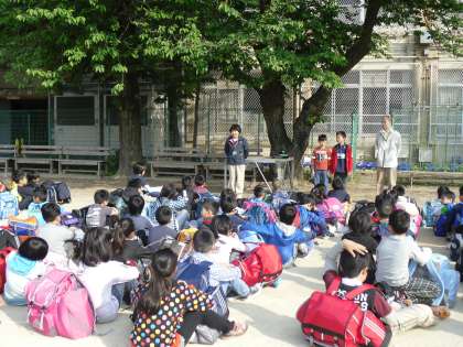 4年生と5組の98名は,遅刻もなく集合しました。(少し忘れ物はあったようですが… )係の児童の司会で出発式が進んでいきました。
