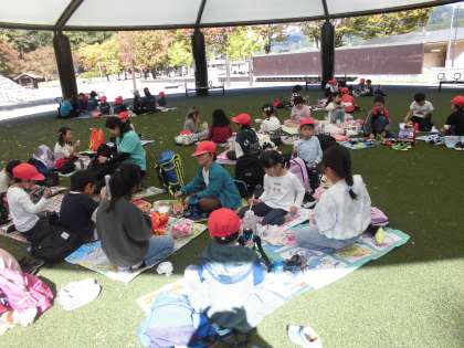 子ども達が一番楽しみにしていたお弁当タイムです。たくさん遊んで体を動かしてお腹がペコペコになりました。友達と話をしながらおいしくいただきました。保護者の皆様、朝早くから準備をしていただきありがとうございました。