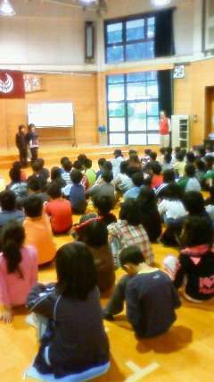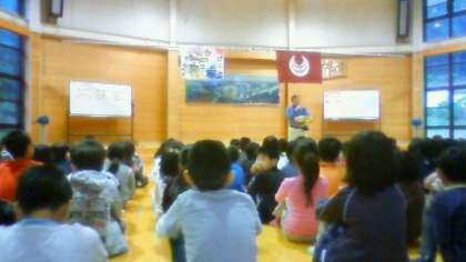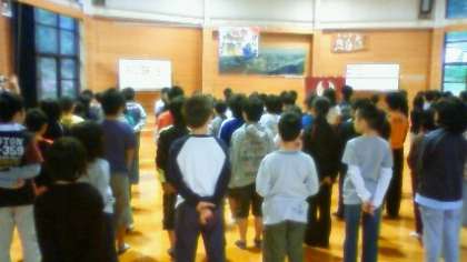 昨夜は遅くまで起きていた子ども達…まだ少し眠そうですが、朝7時から、一緒にみさき家に泊まっている『春日野小学校』と合同の朝のつどいを行いました♪校歌を歌い、学校紹介をし合いました。