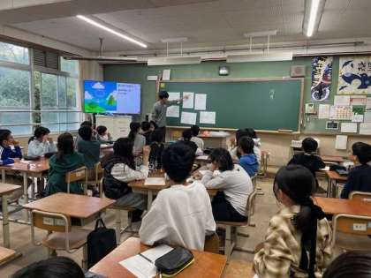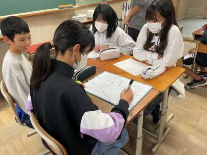 今日は桂川中学校のオープンスクールに参加しました。生徒会の方から、学校の様子や部活動の紹介をしてもらった後、3組は国語科の学習をしました。「言葉で正確に伝えるには」をめあてに、見た絵を言葉だけで上手に伝え、見ていない人が正確に絵を再現できるか、というゲームをして学習をしました。「右側に山があって」「鳥がいるねんけど」「違う違う、鳥はもっとYみたいな形で…」「鳥がYってどういうこと?!」と、言葉で正確に伝えることの難しさを体験できる学習でした。子ども達は、「楽しかった!」と充実した表情でした。