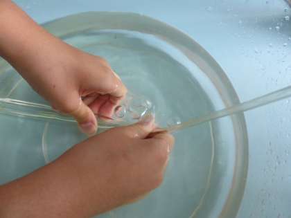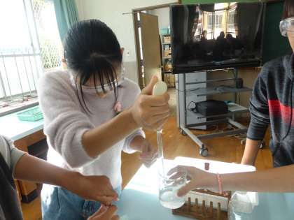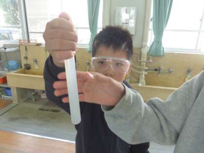 水上置換法で機体を集め、石灰水を混ぜたり燃えている線香を入れて変化を見ることで、溶けているものが何なのかを確かめています。