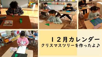 クリスマスツリーを折り紙で作り、周りに雪だるまやサンタクロースを描いたり、丸い白いシールを張ってふきを降らせたりして思い思いの12月のカレンダーを作ることができました。