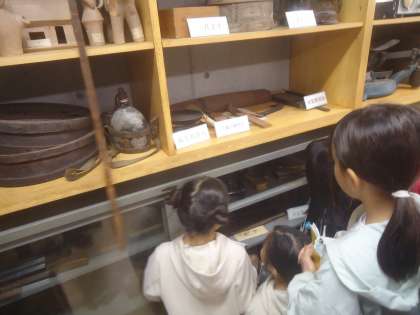 社会科「市のうつりかわり」で時代の変化とともに道具も変わってきたことを調べた子ども達。本物があることを伝えると、「見てみたい!」という子がおり、休み時間に見に行きました。
