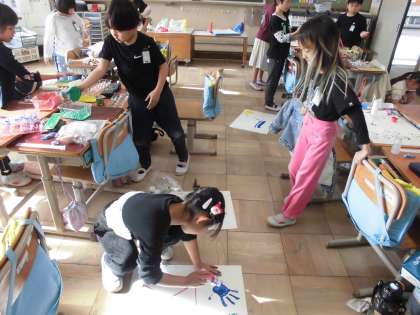 絵の具を付けてうつすとどんな形になるのかや形を並べたりつないだりするとどうなるかを楽しみながら表しました。色や材料を変えてイメージを広げたり工夫したりしていました。