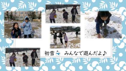 今シーズン初めて雪が降った金曜日、2時間目の途中から外の様子が気になる子どもたち…。中間休みの始まりのベルが鳴ると同時に外へ駆け出しました。