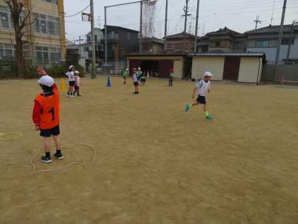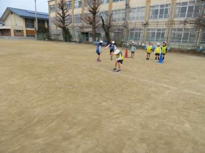 じゃんけんとびあそび(グー・・・グリンピイス、チョキ・・・チヨコレイト、パー・・・パイナツプル)や島とびをしています。どうやったらより遠くへ跳べるかな?とグループで話し合いながら活動しています。調子よく連続で跳べる子が増えてきました。