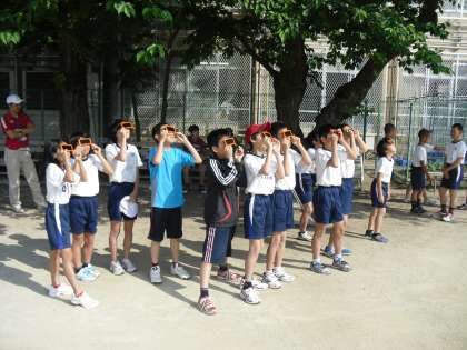 21日は金環日食でしたが,全国的に曇り空の多い中,京都では晴れの観測日和となりました。6時過ぎから始まった太陽の欠けが終始見られる好条件となりました。登校した子は理科室の遮光メガネを使って,日食の終盤を見ることができました。また,金環のピーク時には,校門付近に映る木漏れ日の全てが,金環の形になっていたのは驚きました。次に京都で金環日食が見られるのは2041年だそうです。