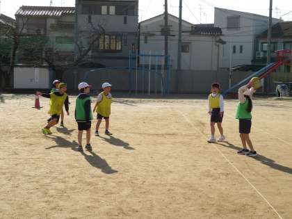 今週からボールけりゲームをしています。自分たちで準備をして声を掛け合ってゲームをすることができています。