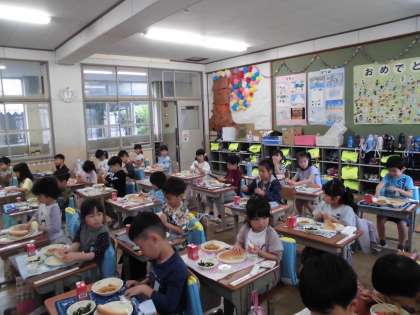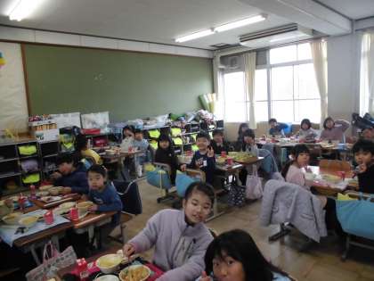 1年間でたくさん給食を食べて心も体も成長しました。おかわりをする人が増えて足りないときもあるほどでした。感謝の気持ちを忘れずに2年生になってもおいしく味わって食べてくださいね。