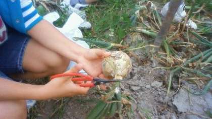 玉ねぎをひき、根と葉をハサミで落してきれいにします。