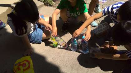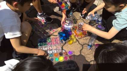 図画工作科の「ひかりのプレゼント」で作った容器を、今日ようやく太陽の光にあてることができました。地面にうつる虹色の光を見て、子どもたちは大喜び!友達と一緒に、「タワーにしてみよう!」「光の町にしてみよう!」と言いながら、楽しく活動することができました。