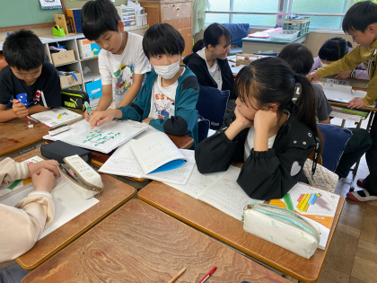 算数科「分数のわり算」の学習を進めています。分数のわり算ではなぜ逆数をかけるのか、みんなで考えました。これまでの学習から考えを導き出していました。