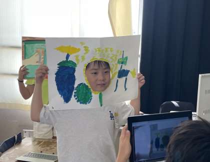 サッカーボールが自分の顔になる人、ドラゴンが自分の顔になる人、それぞれ自分の思いを絵にしました。