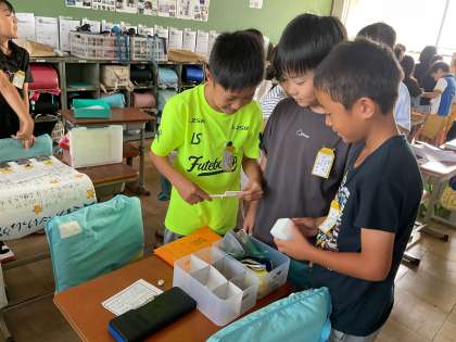 夏休みの思い出ビンゴをしたり、友だちの自由研究を見たり…。友だちの作品に興味津々の子ども達。
