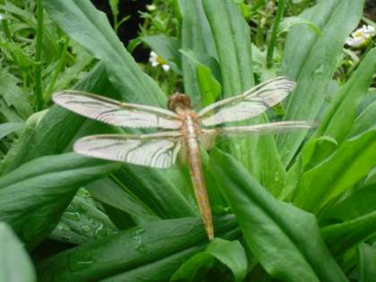 子ども達が気がついて観察をしていました。ヤゴがこれから羽化する状態のもの,羽化した直後の羽が伸びきっていないもの,ほぼ羽が伸びきり体の色もはっきりしてきたものと,様々な状態のトンボが一度に観察できて興味深かったです。