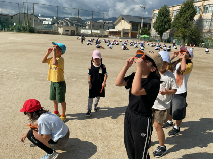 かげはどこにできるのかを予想して、実際に外に出てたしかめました。