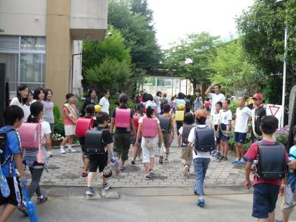 児童会本部役員と担当の先生方が,校長先生と一緒に毎日集団登校を迎えました。