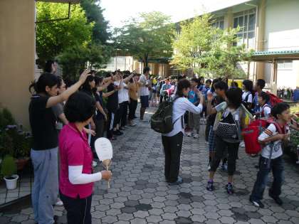 5年生は,今日から花背山の家で4泊5日の長期宿泊学習です。今日は天気もよく,全員参加で元気に出発できました。