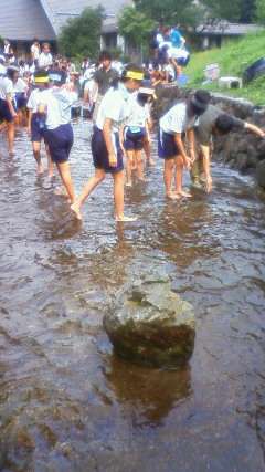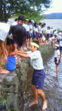 みんな体操服で魚つかみに挑戦!