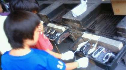 つかみ取った魚を自分たちの手でさばき、串を刺して、塩をふり、炭で焼いていただきました。
