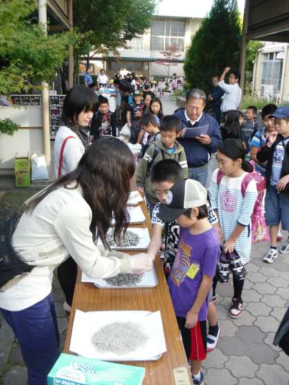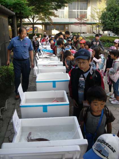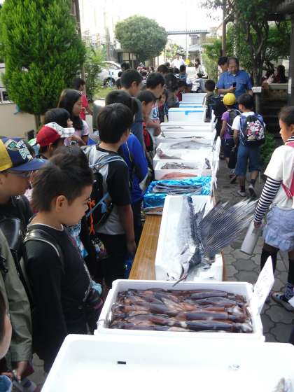 朝,7時前に搬入された魚や乾物はすぐに中庭に展示されました。登校してきた児童は思わず足を止め,普段良く食べる魚や珍しい魚に見入っていました。さながら「行列のできる魚屋さん」という感じでした。