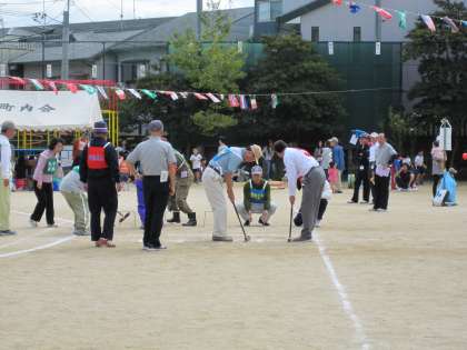 ゲートボールリレーでは日頃の腕前を披露。会長さんもネクタイ姿でがんばっていただきました。