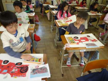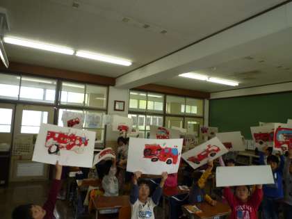 今は,教室で線を生かして消防車に色をつけています。ていねいに,ぴかぴかに光る車ができ上がるといいですね。