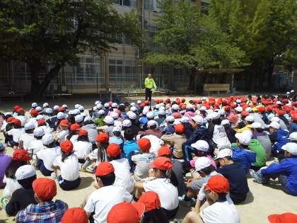 最初に校長先生のお話を聞いて出発です。