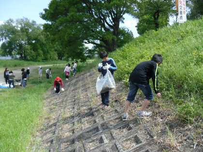 環境教育に力を入れている本校は,年6回 地域や校内の清掃に全児童取り組んでいます。1年は校内清掃 2年は学校周辺3年は桂川街道沿い 4年5年6年は交代で桂川河川敷を清掃します。