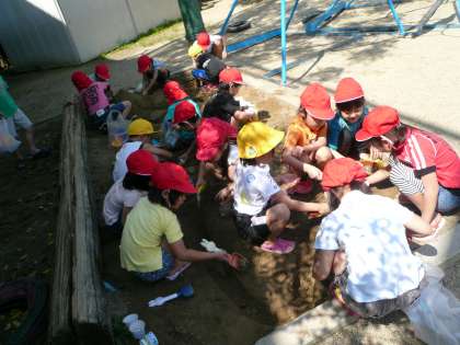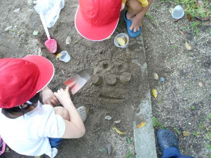 山を作ってトンネルを掘ったり,カップでポンポンしてアンパンマンを作ったりしている子どもたちもいました。