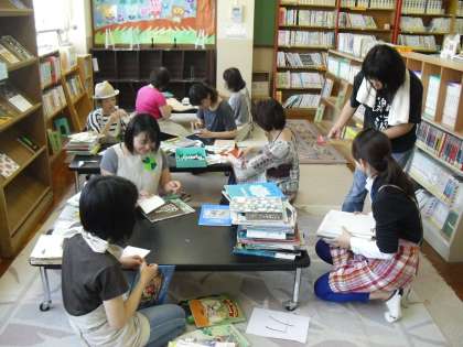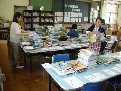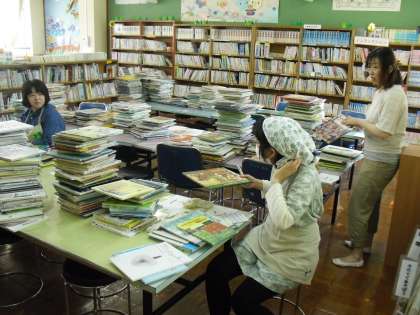 クローバーの会の皆さんと図書館教育担当の教員とも協力して図書館の改造中です。 今日は,これまで本の名前で整理していた本を,作者名で整理しなおしていただきました。