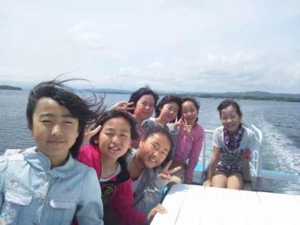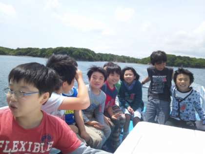 真珠養殖のいかだが浮かぶあこ湾を船で「なかよし港」に向かいます。