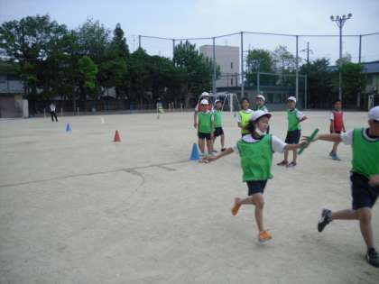 暖かい日(暑い)が続いていますが,5年生は体育で元気にリレーをしています。仲間を応援する声が運動場に響き渡り,活気のあるレースが繰り広げられています。バトン渡しも徐々にうまくなり,タイムも上がって来ているようです。