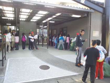 6時に起きた子どもたちはテントとバンガローの片付けをして寝袋を返すチェックを受けています。