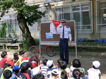 警察官の方にきていただいて,左側から乗ること,右足ペダルにかけて右後ろを確認してから出発することなど,教えていただきました。