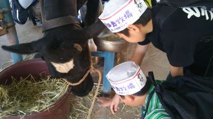 乳しぼりのあとは、牛と触れ合ったり、ポニーや子牛を見たりして楽しんでいました。
