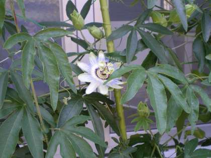 今日,トケイソウの花が3つ咲きました。名前の由来どおり,めしべの形が時計の針そっくりです。何とも個性的な花ですね。